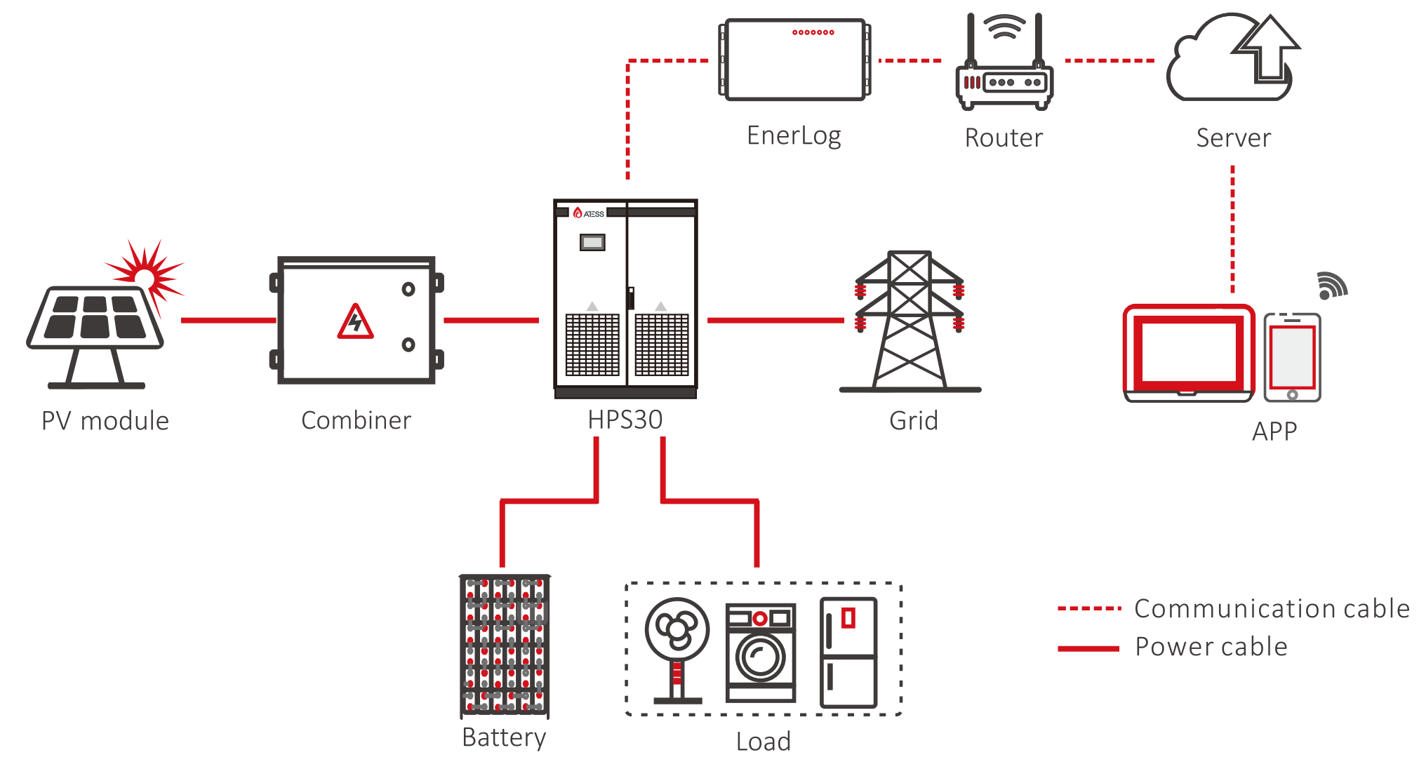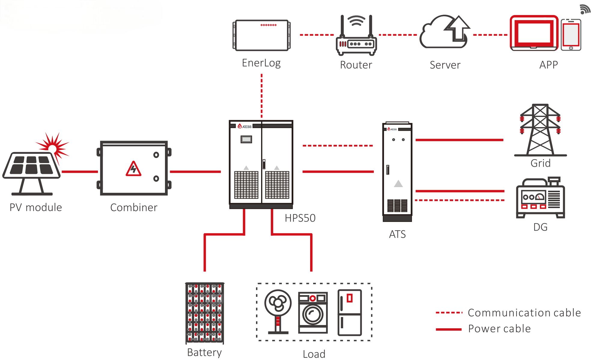 Designed for small and medium C&I applications, the Atess hybrid inverter series (30-150kW) offers versatile integration of battery storage, load management, grid connection, and solar PV. The solution supports system configurations with a total capacity of up to 600kW.